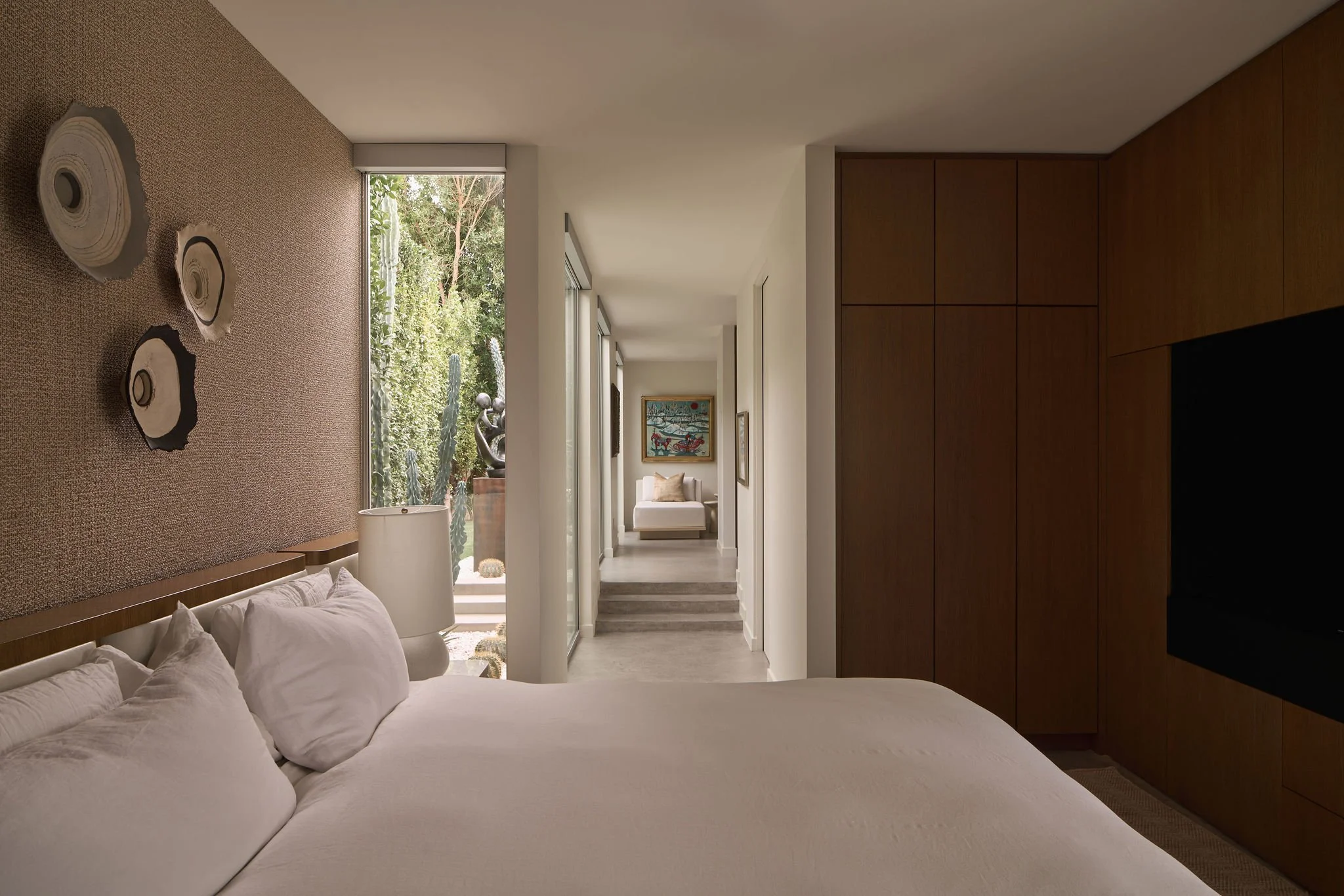 Throughout the home, midcentury influences blend with contemporary flourishes. Custom partitions with a white honeycomb cutout motif separate the entry hallway from the kitchen and living space — a nod to retro Palm Springs but reinterpreted with clean precision. These partitions, designed by the interior designer James McIntyre, offered a visually interesting moment that photographed beautifully from multiple angles.